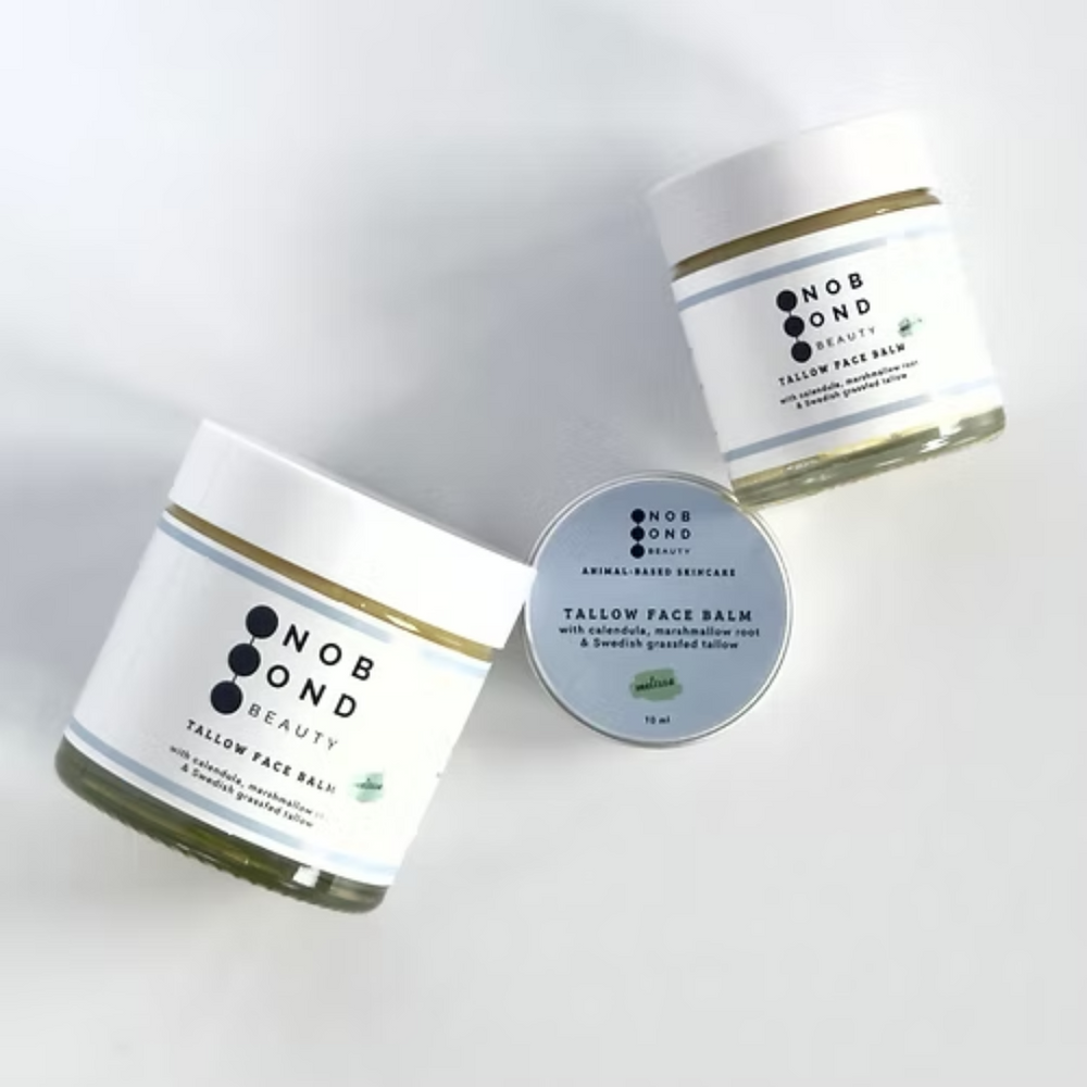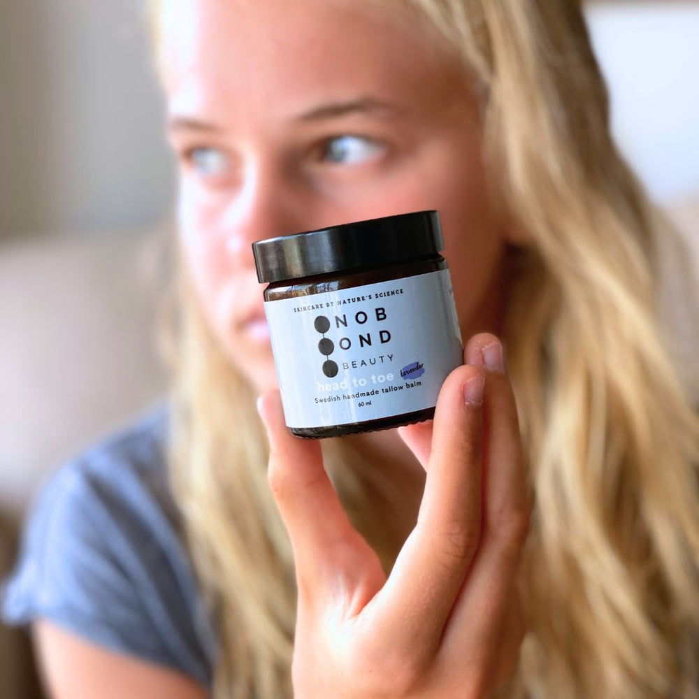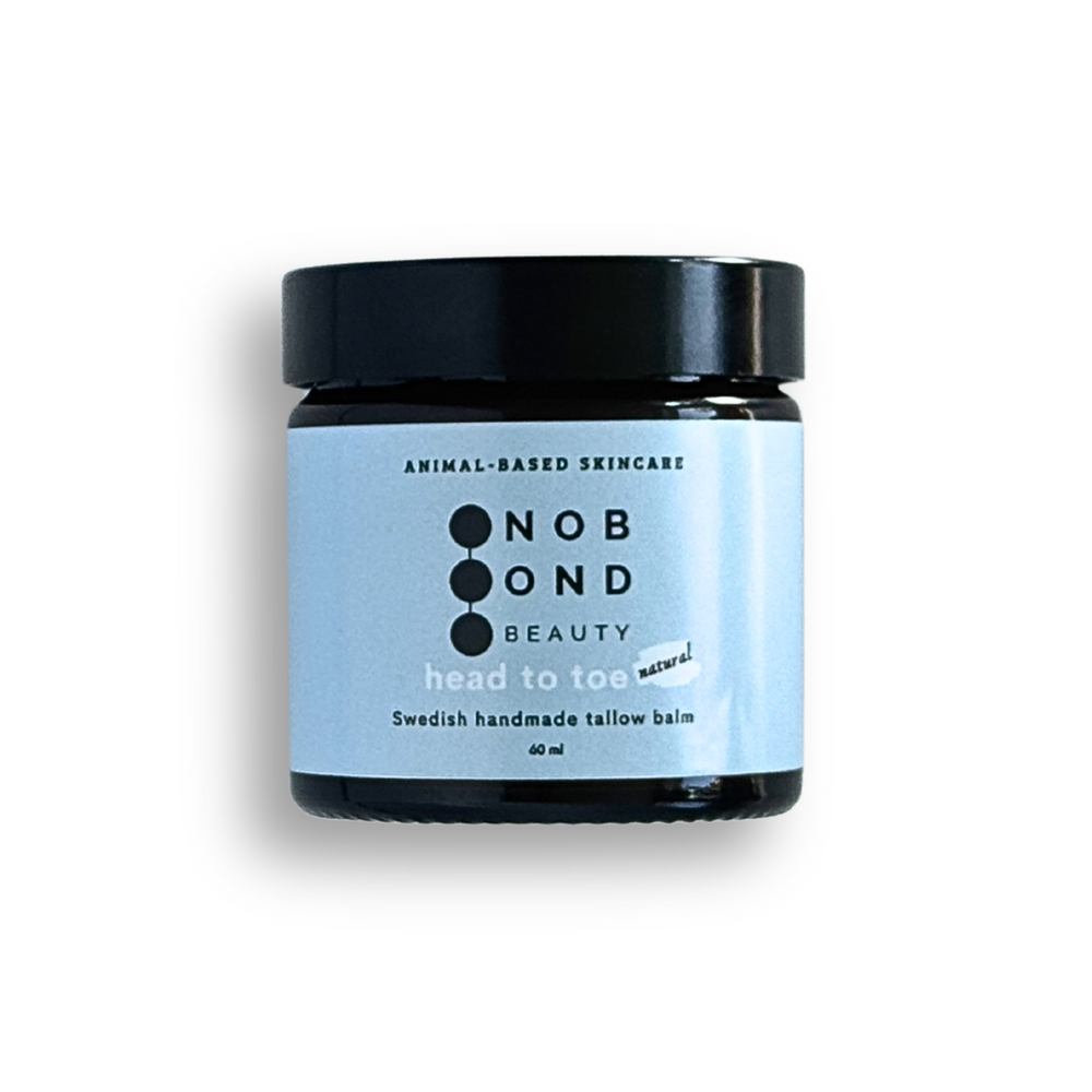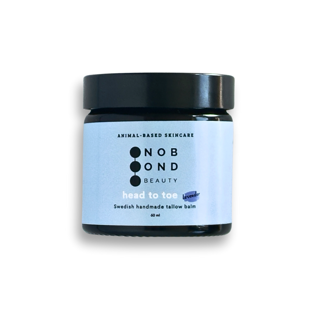 The emollient properties of tallow, together with olive oil, are gentle on the skin and keep it soft and re-greased after sunbathing.